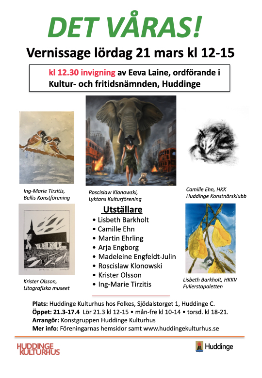 Lördag 21 mars 2026, kl 12.00 Konstföreningarna Huddinge Kulturhus Det våras! Konstutställning Vernissage 21 mars kl 12-16Pågår till 17 april. För öppettider klicka på loggan till väster
